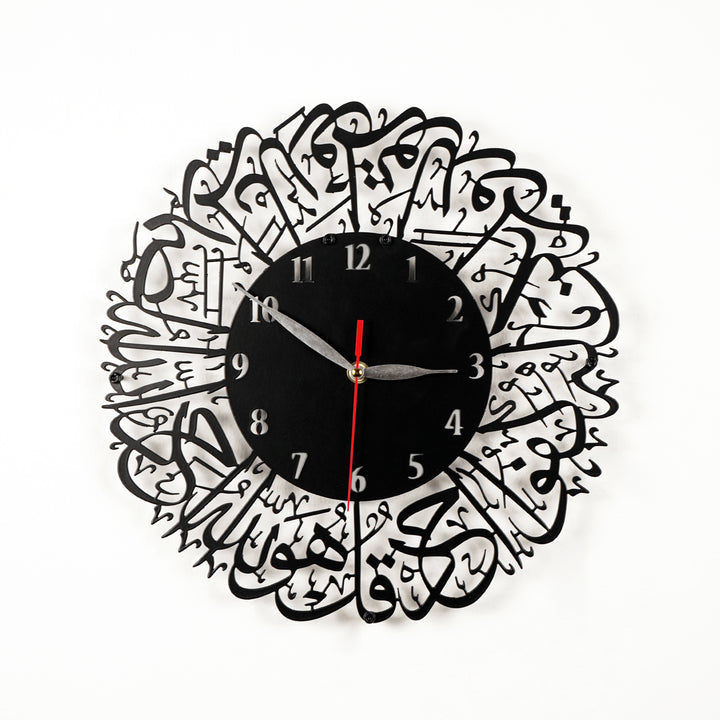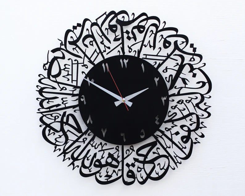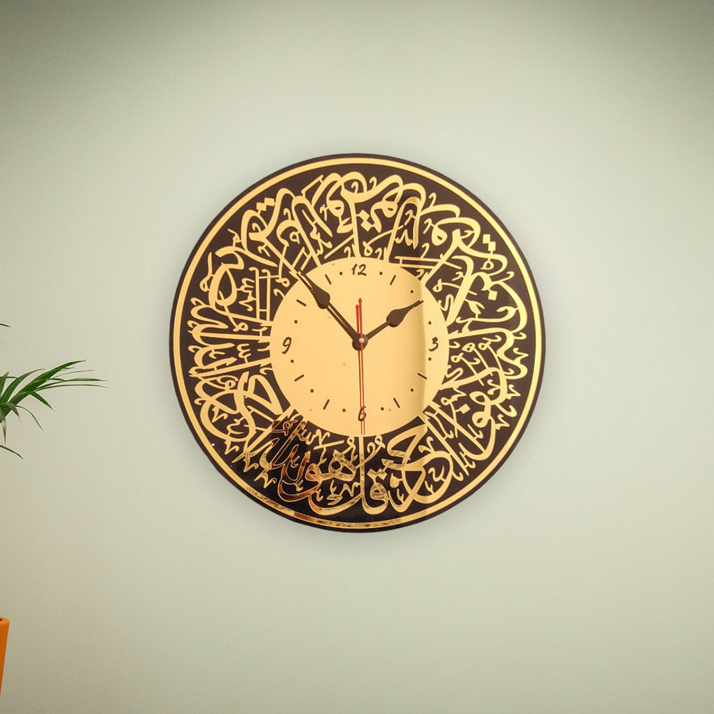 Surah Al-Ikhlas Islamic Wall Clock | Arabic Calligraphy Clock in Black-Gold Acrylic | Muslim Home Decor